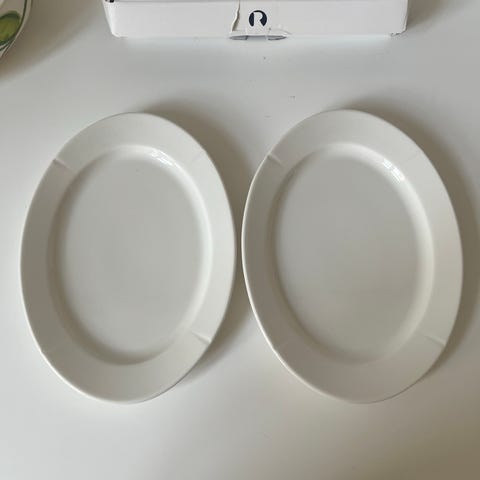 Stelton -ovale middagstallerkener i hvid porcelæn. 6 stk. ..meget fine .. sælges samlet for 200 kr.. En har et lille næsten usynligt afslag, deraf den billige pris. Yderste mål 33 x 25 cm..inderste mål (spisemål) 20 x 24 cm... højde 2,5 cm