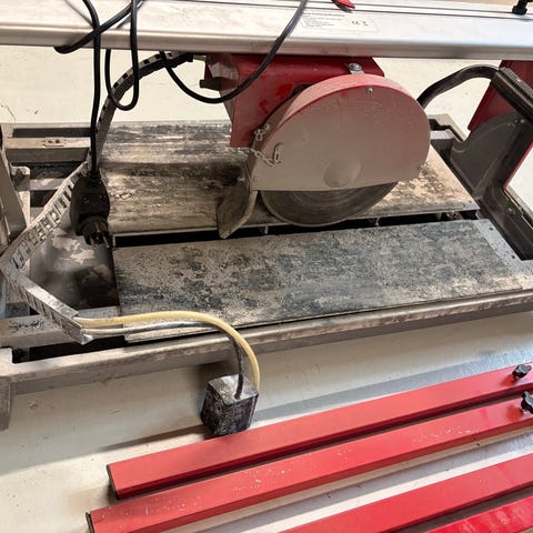 Ukendt Bordmodel Sten- og fliseskærer med elektrisk motor, metalramme og skærebord med flere huller. Maskinen er beregnet til at skære sten og fliser og har en robust konstruktion med ben til stabilitet. Kan anvendes til bygge- og anlægsarbejde, hvor præcis skæring af hårde materialer er nødvendig.