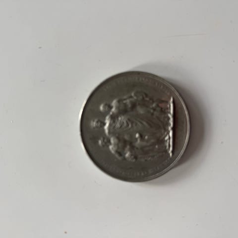 København Mønt KØDBYEN fra 1934-1984 lavet i sølv ( måske ) . Mønten har en diameter på cirka 2-3 cm og viser et billede af Københavns byvåben på den ene side