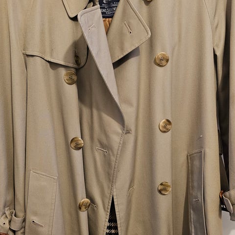 Classic Burberry long trenchcoat, male size LONG 48. Vintage model with the old “Burberrys” logo. Belt included.