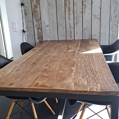 Bordet er i god stand, men kan med en overfladisk slibning og lidt olie blive så godt som nyt.