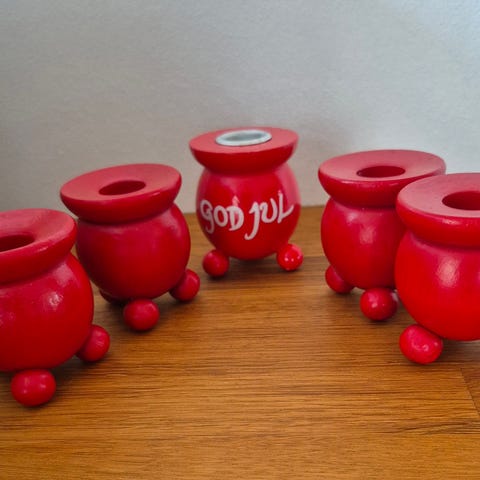Flotte til jul, 2 af de er til små lys og den enlige er til kronelys, parret er 16 cm høje og koster 200 kr, den enlige er lidt over 14 cm høj og koster 100 kr, 250 kr samlet.