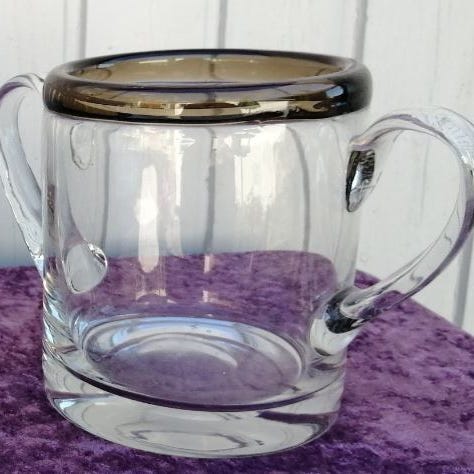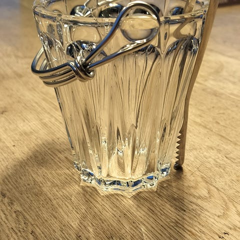 Smuk lyseblå vintage isspand fra svenske Strømbergshytten. Glasset er tykt og nærmest kantet. Højde 18 cm. Der er et mikro ubetydelig nag i kanten. Håndtag og rist fremstår helt blanke.
