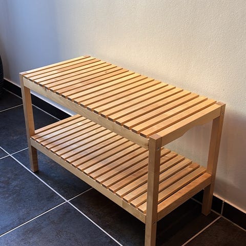 Vaskebænk fra Herlev hospital med metalstel og træplanker. Bænken har en robust konstruktion med metalramme og flere træplanker som siddeflade. Velegnet til indendørs eller udendørs brug.