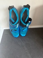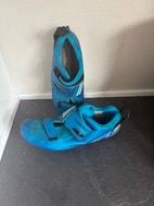 Shimano cykelsko i størrelse 45, blå farve. Skoene har justerbare stropper og er designet til cykling med et åndbart materiale.