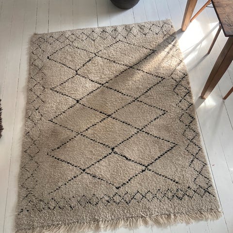 Charmerende ægte marrokansk tæppe med omvendt beni ouarain-mønster, sælges grundet flytning.