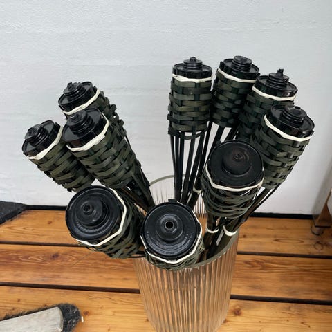 3 håndlavede glasfakler til ophæng (gummiophæng medfølger) eller til placering i græs, jord eller sne. Til fest, jul eller nytår. Til lampeolie, kan brænde mange timer. Har været brugt få gange. 1 ekstra væge medfølger. I original emballage. Udgået model.