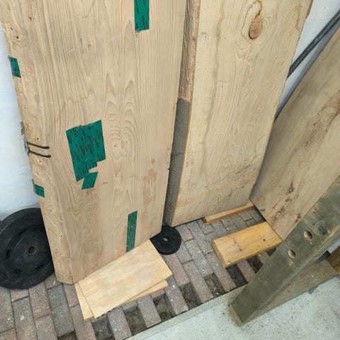 7 egetræsplanker, rå, massiv, 110 - 160 cm lange, 4 - 6 cm tykke og 20 - 40 cm brede