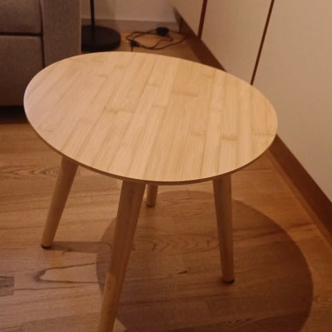 Træbord (jeg mener det er bøgetræ) med målene 68 x 68 cm i ludfarvet finish. Bordet har en firkantet bordplade og fire ben, lavet af træmateriale. Velegnet til brug som sidebord.