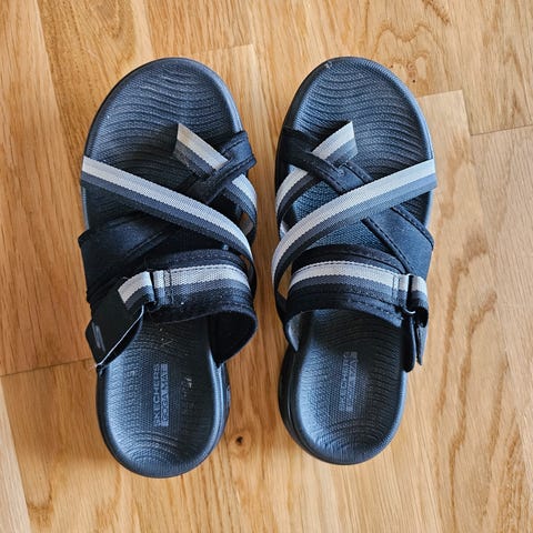 Skechers sandaler i størrelse 40, sort farve. Sandalerne har justerbare stropper og en gummisål med mønster for bedre greb. Materialet består af syntetiske stropper og en blød sål for komfort. Velegnet til dagligt brug.