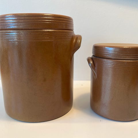 2 franske stentøjskrukker. Højde 13cm og diameter øverst 12,5cm. 200kr pr. stk.