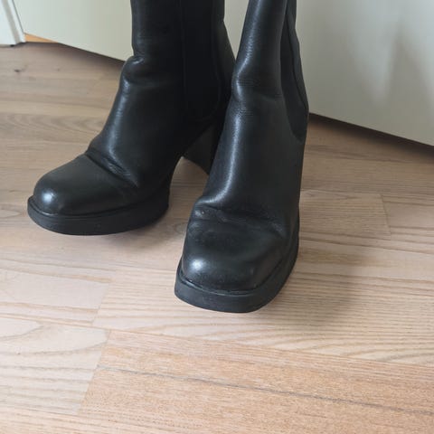 Støvlet med flere fine detaljer. I skind med lille hæl og lynlås i kappen.