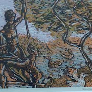 Særker Sørensen. And i park. Farvetræsnit. Signeret og nummereret 169/250. 56 x 42 cm. (På min side findes et lignende farvetræsnit af Særkersørensen. Begge kan erhverves til en samlet pris på 600 kr.)