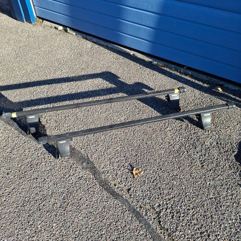 Thule tagbøjler i aluminium med sølvfarve fra 2021. Har været brugt til en Hyundai i30 stc. De er fuldt funktionsdygtige. Bredde: 117cm
