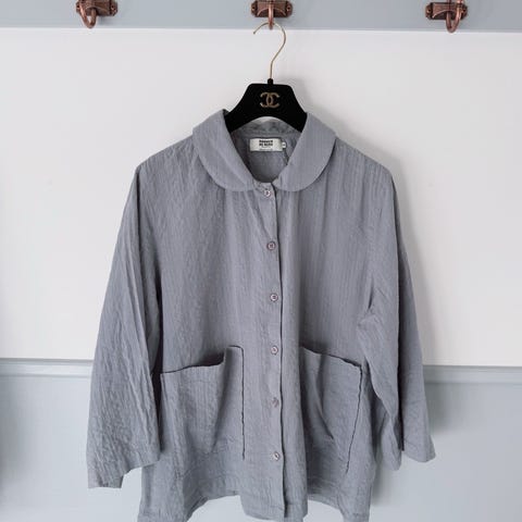 Magasin du Nord skjorte i str. xs. Stribet, beige, tætvævet stof. 83% økologisk bomuld, 14% hør, 3% elastan. Brugt få gange.