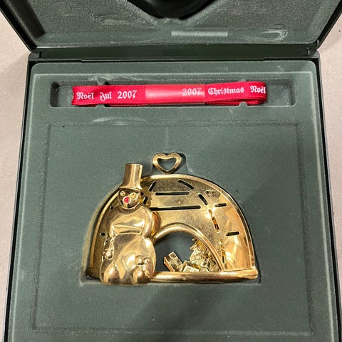 Guldfarvet, selvom den ser lidt sølvfarvet ud på billederne, med originalt rødt bånd.