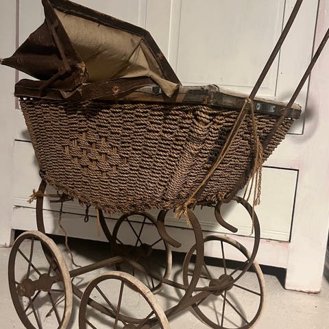 Gammel dukkeseng. Der mangler en enkelt tremme i den ene side samt afslutningsstykket på to af sengestolperne.