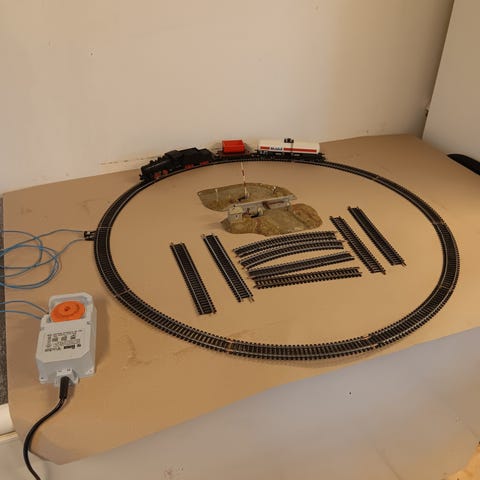 Pioner modeltog sæt inklusive et sort damplokomotiv, rødt tankvogn med Esso branding, samt flere røde og sorte vogne. Sættet indeholder også en Pioner transformer med reguleringsfunktioner og forskellige spændingsindstillinger (220V, 6-18V). Togbanen og tilbehøret er lavet af metal og plastik. Sættet er velegnet til modeljernbaneentusiaster og samlere.