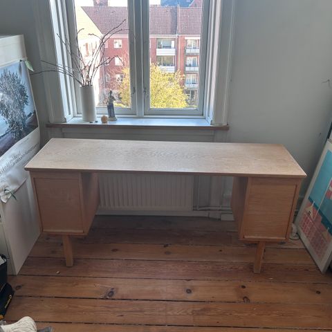 Antikt, vintage, min fars gamle skrivebord. Jeg ved desværre ikke, hvilken træsort det er, men bordet er tungt og solidt. Ikke noget du finder i IKEA eller Jysk. En lille kant er faldet af, se billerne. Hvis det er en formue værd, så giv 500 ekstra.