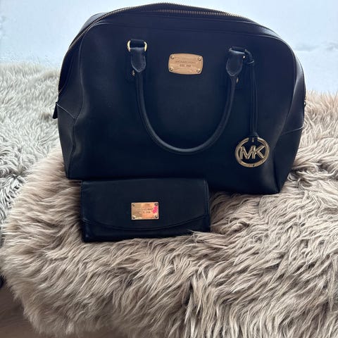 Beige grå Michael Kors læder håndtaske L27 cm, B8cm og H21cm. Pung l20 cm, B2 cm og H10cm.