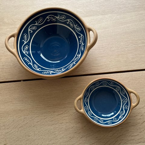 2 fine glaseret skåle i grå farve og med blåt.