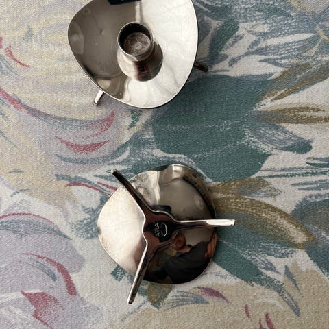 To halvgamle (trekantede) kertestager fra Cohr på tre ben. Jeg mener, det må være sølvplet, men ved ikke hvad mærket betyder (måske er det ATLAs mærke).
