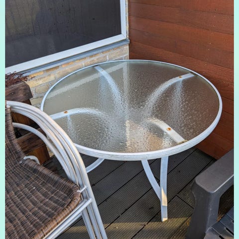 Bordet har nogle skrammer på bordpladen.