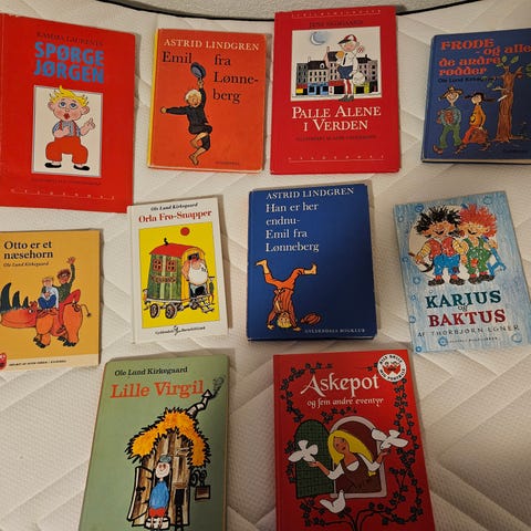 Fire bøger af Astrid Lindgren: Pippi Langstrømpe, Mio min Mio, Folk og røvere i Kardemomme by, og Emil fra Lønneberg. børnebøger illustreret og skrevet på dansk.