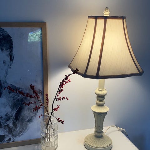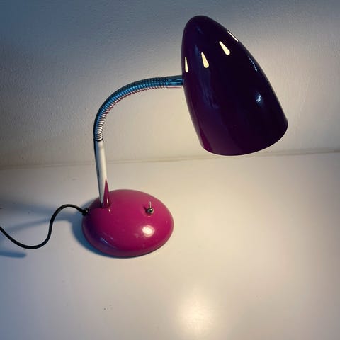 2 flotte lilla (farven er mest troværdig på væglampen på foto 3) lamper, retro style. Den ene til at hænge på væggen og den anden er en bordlampe. Der medfølger en pære, der pt. fungerer, i bordlampen.