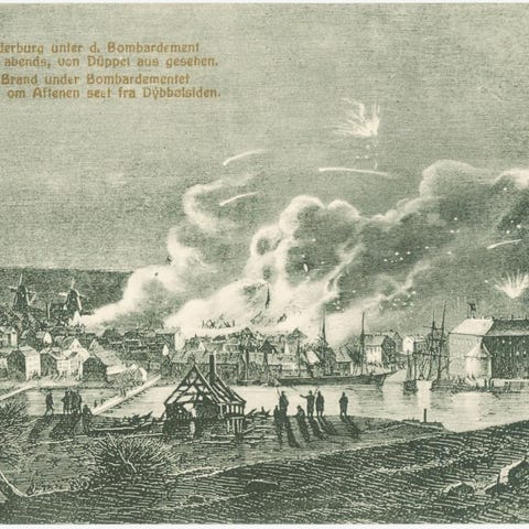 Ubrugt postkort med en scene (malet af Christian Mølsted) fra den danske fregat Niels Juel i slaget ved Helgoland den 9. maj 1864, hvor bl. a. den tyske fregat Schwarzenberg blev skudt i brand. Kortet er som nyt – i bedste kvalitet.