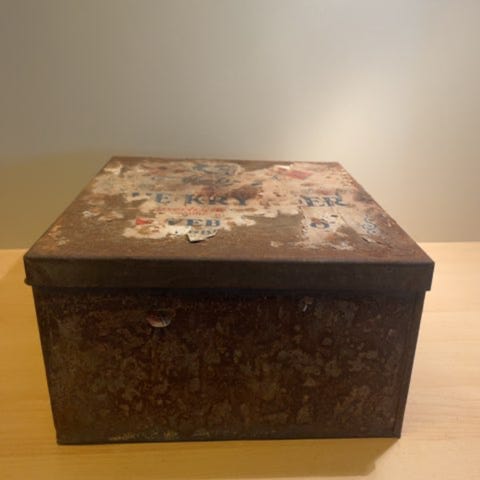 Rustik gammel æske i blik fra biskuitfabrikken Oxford i Hjørring. Boksen har et klassisk design med tekst og mønstre.,Afhentes i:,Røde Kors Sorø (335),Bemærk at mail, chat og beskeder ikke besvares, og varen skal købes på knappen "Gå til varen"