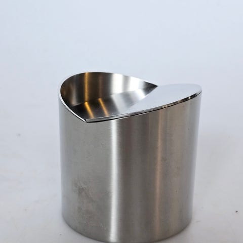 Arne Jacobsen for Stelton vippe askebæger af stål. Diam. uden hank 7,5 cm. I pæn stand uden buler eller dybe ridser, men med forventelig patinering fra almindelig brug.