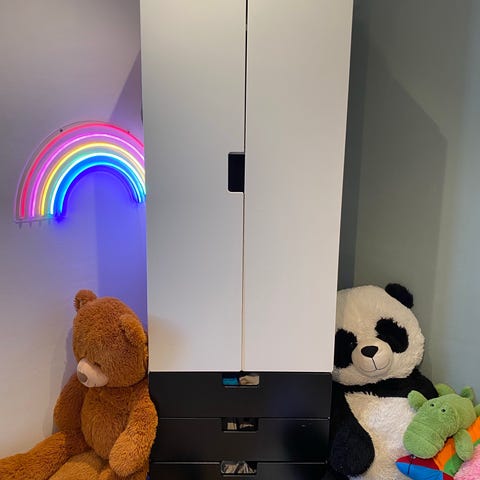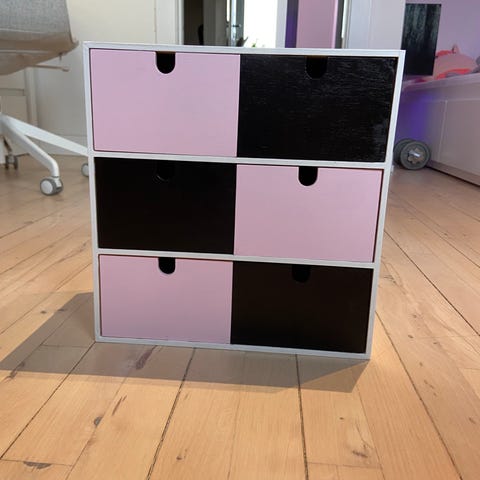 Ikea Busunge skab til børneværelset. Ikea sælger det kun i hvid idag, men dette er lyserødt. Der er en ekstra hylde, som vi ikke har brugt. Der skal hentes nye dimser til at sætte den op, hvis man vil bruge den.