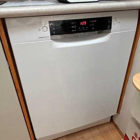 Bosch Integreret Opvaskemaskine SilencePlus. Betjeningspanelet er placeret på toppen af døren og indeholder flere funktionstaster til forskellige vaskeprogrammer. Oprindelig låge sidder stadig på. Er placeret på 1. sal.