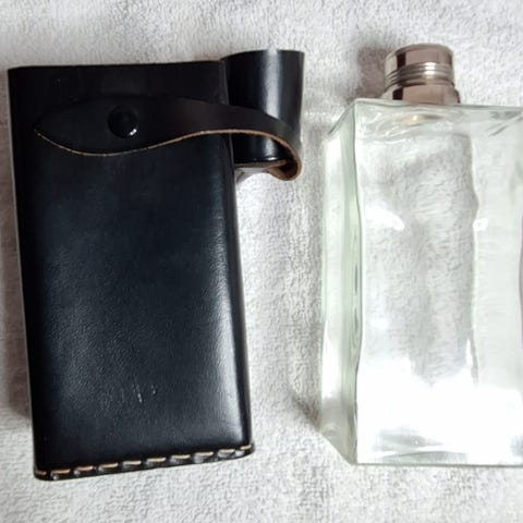 Et sæt af 4 stk. jagtbægre / dramglas / snapsglas af rustfrit stål med etui af læder. Store, så bruges til whisky / vin. H. 6 cm. I pæn stand uden buler eller dybe ridser, men med forventelig patinering fra almindelig brug.