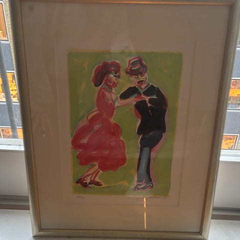 Ungarsk dans er et smukt og stærkt eksempel på Vogt Steffensens kunst. Det er et originalt litografi, trykt i 1980, som nr. 5 ud af 100 tryk. Lysmål 43 x 52 cm og rammemål 66 x 74 cm. Det med passe partout og med en smuk, gylden træramme.