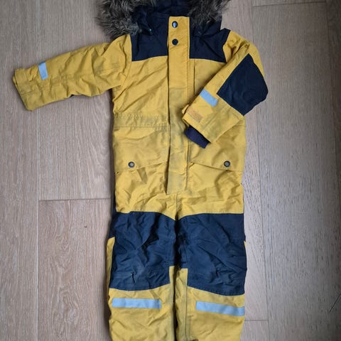 Lækker vandtæt flyverdragt brugt af et barn i to sæsoner. Oprindeligt størrelse 90, men kunne udvides til 100/104, hvilket er den størrelse, den så har nu.
