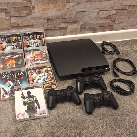 PlayStation 3 spilkonsol med to trådløse controllere. Medfølgende spil inkluderer Dragon Age II og Assassin's Creed III. Konsollen er sort og anvendes til underholdning og gaming. Fjernbetjening medfører