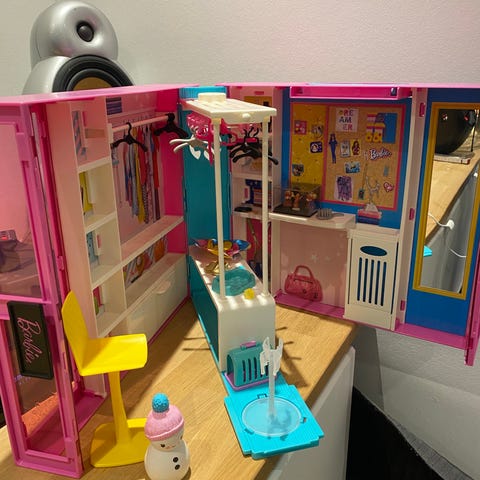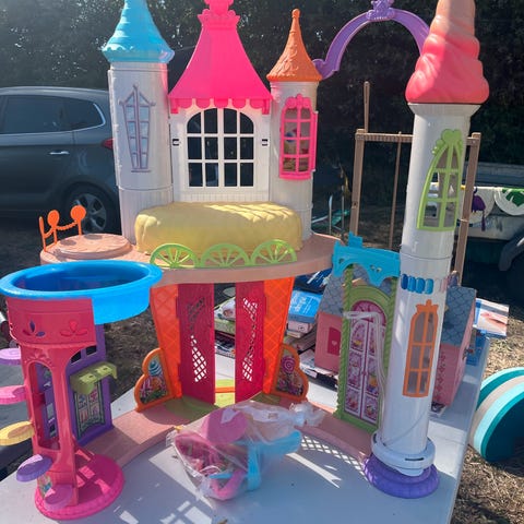 Barbie Dream Castle legetøj i pink og lilla farver. Legetøjet forestiller et slot med tårne, balkoner og døre. Materialet er plast. Passer til børn som en del af Barbie-legesæt.