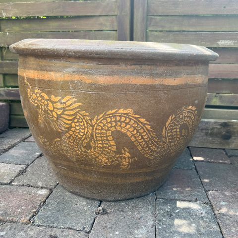Stor flot gammel havekrukke med drage motiv ca 50 i diameter 38 høj