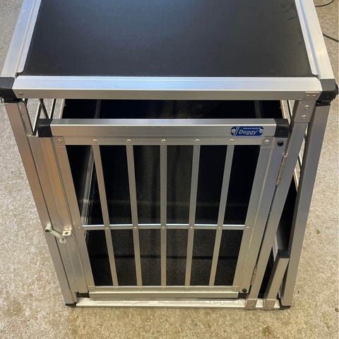 HAKON Hundebur i metalramme med træbund og træpanel på fronten. Mål.