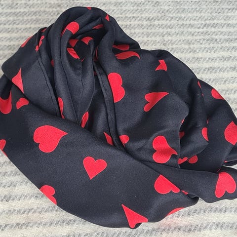 160 x 33 cm, sort, rød, i 100% silke. Vintage, fremstår uden brugsspor. Med håndrullede kanter.