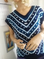 Andet, strikket bluse top vest fra 80erne, hjemmestrikket, str. 36 - 38, blå og hvide farver, blandingsgarn, Næsten som ny, en hjemmestrikket kortærmet bluse fra 80erne strikket i diverse blå farver akryl bomuld mm i blandet landhandel . skråt strikket og kort . kan også bruges som vest over en t shirt eller skjorte i fejlfri stand . sendes for købers regning eller hentes her .