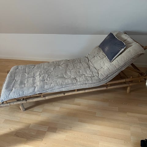 Super skøn daybed med 14 originale flotte puder. En dejlig flyder der er ideel til at stå i stue, havestue eller pergola. Flotte fjerfyldte puder med Egyptisk vintage Luxorstof.
