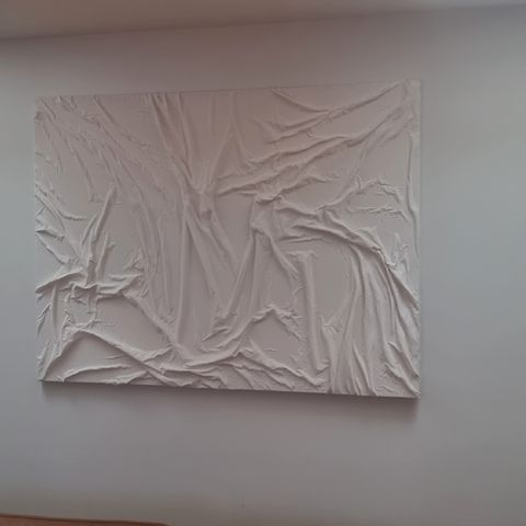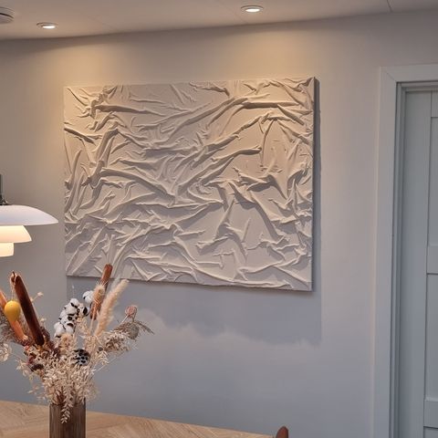 Abstrakt hvid vægkunst med 3D-effekt, skabt ved hjælp af teksturerede folder og linjer. Maleriet har en moderne og minimalistisk stil, der kan anvendes som dekorativt element i forskellige rum såsom stuer, kontorer eller gallerier. Værket er i neutrale hvide nuancer og fremstår som en stor flad overflade med dybde og struktur.
