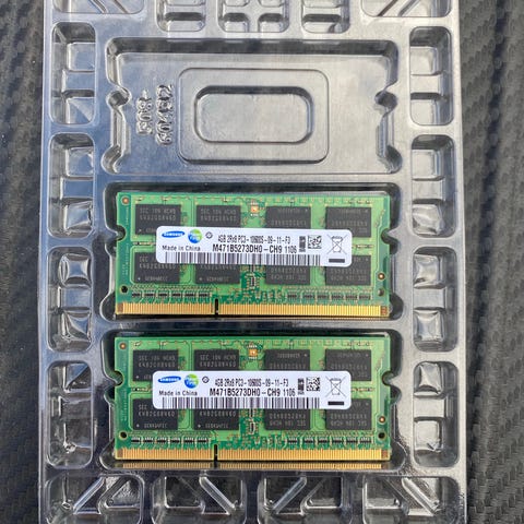 Samsung M471B5673EH1-CF8 RAM-sæt bestående af to 2 GB DDR3 PC3-8500S-moduler. Designet til brug i kompatible bærbare computere eller computere med lille formfaktor, der kræver DDR3-hukommelse.