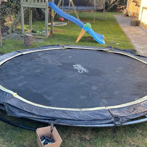 Firkantet trampolin med stige og net fra 2020 (nypris 5.995,-) kvittering haves. Skal skilles ad.