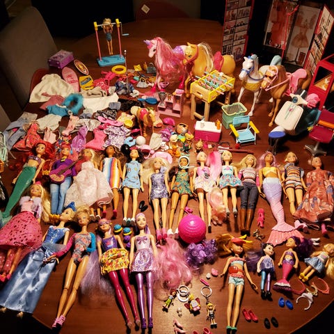 Min datter sælger alt ud af hendes barbieherligheder. Slot, stald, heste, 8 barbier, 4 Ken-dukker ( nogle kan skifte hår) dyr, dynger af accessories, tøj, køkkengrej, frisørsager, biler, cykel...Det hele sælges samlet for 900,- kufferten følger med. Det er brugt, men I får meget lækkert for pengene.