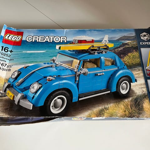 Lego Icons folkevogn. Et rigtigt samleobjekt. Den har tilhørt min far, som havde sådan en boble som bil da han var ung. Den har været samlet nogle gange og ellers stået til pynt i et ikke-ryger hjem uden børn. Enkelt lyseblå klodser er bleget af solen, men disse kan erstattes med nye, eller blot vendes indad. Alle dele er der og er talt 2 gange.
