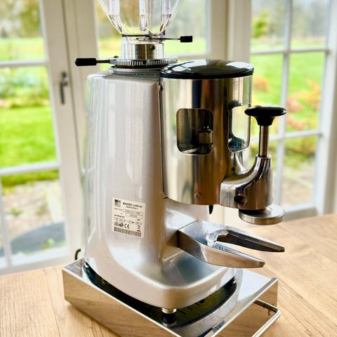 Ditting KF 804 kaffekværn, fremstillet i Schweiz. Modellen har indstillinger for formalingsgrad med markeringer fra Mokka, Espresso til Stempel kaffe. Designet til professionel brug. Har poseholder. Bundsolid kværn(vægt: 22 kg) der lige har fået nye skær.